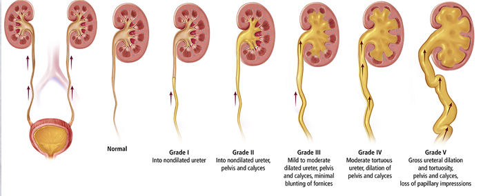 VUR can be primary (due to congenital weakness of the valve) or secondary (due to blockage, bladder dysfunction, or neurogenic bladder). The condition is graded from I to V based on severity, with Grade I being mild and Grade V being severe with kidney swelling.